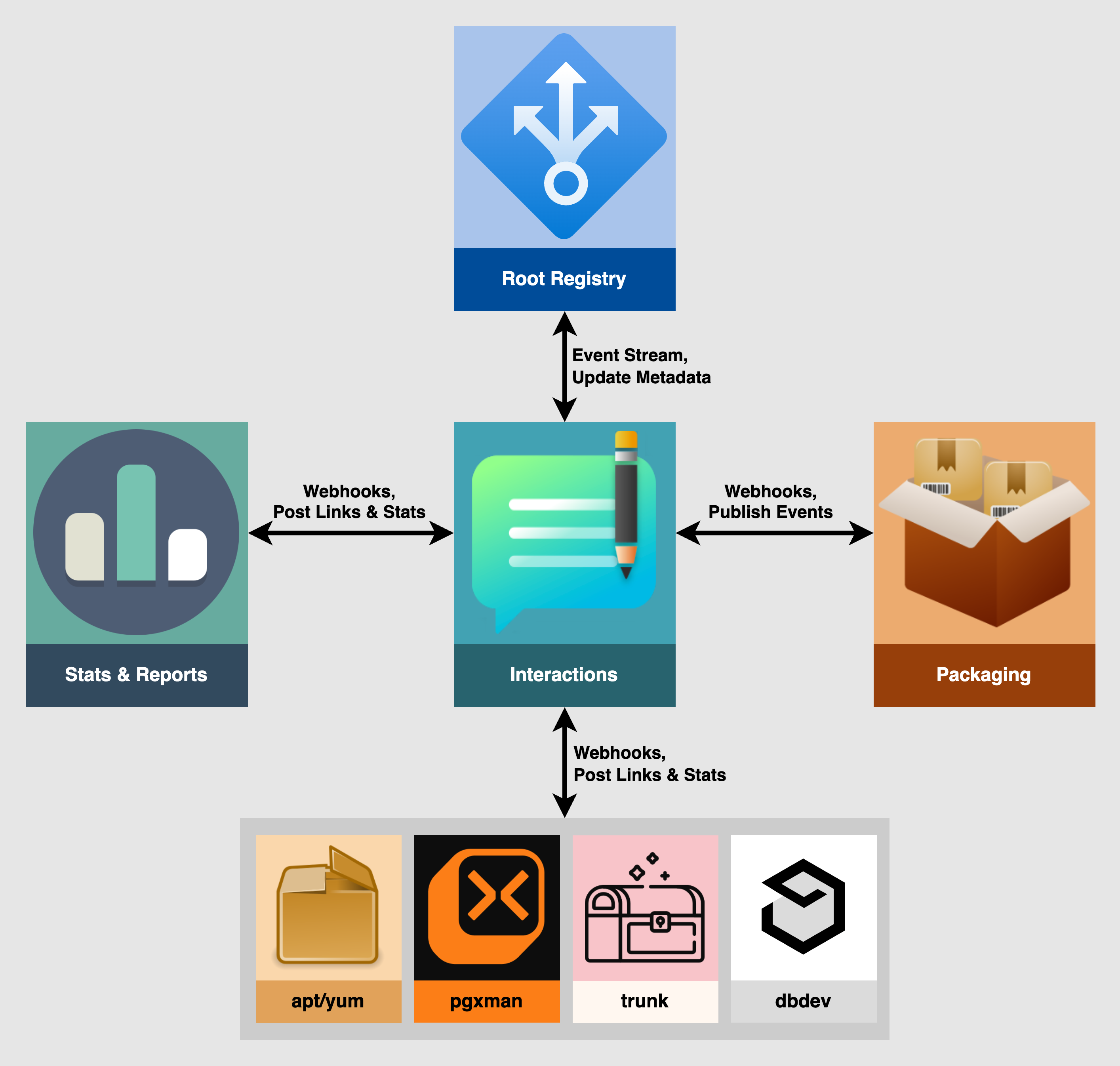 High-level diagram of the Interactions service in context with other services. The Root Repository publishes events to the Interactions service, which then forwards them to registered, trusted Packaging and Stats and Reports services via webhooks. Those services can also submit information back to the Interactions service, including packaging links, stats for aggregation, and other links and badges.